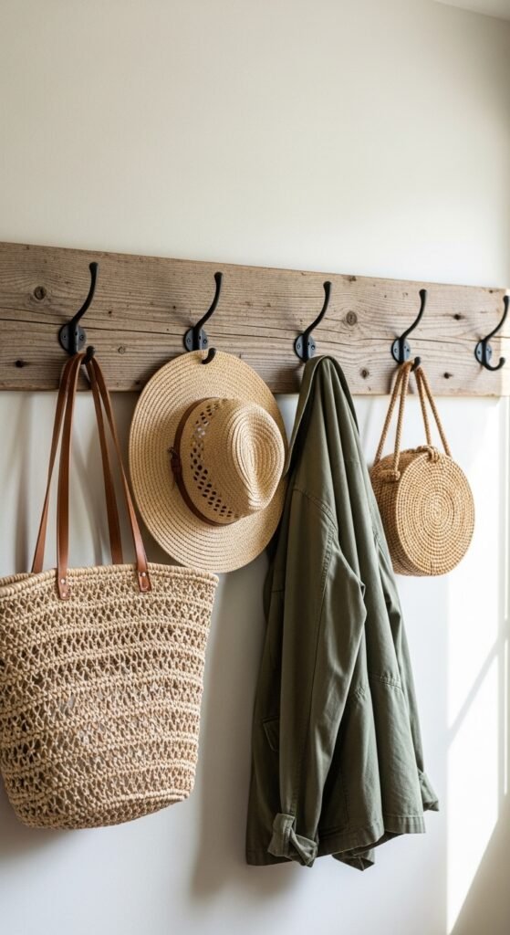 Farmhouse entryways shine when they’re practical. Hooks keep clutter off the floor while adding character to your walls.