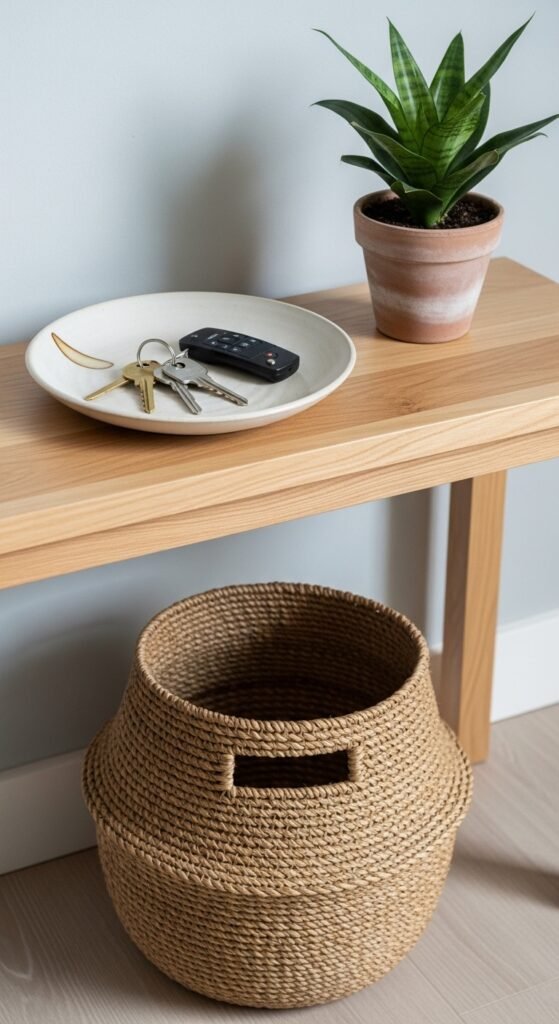An entryway table should work as hard as it looks good. Adding at least one functional element keeps the space realistic for daily life.