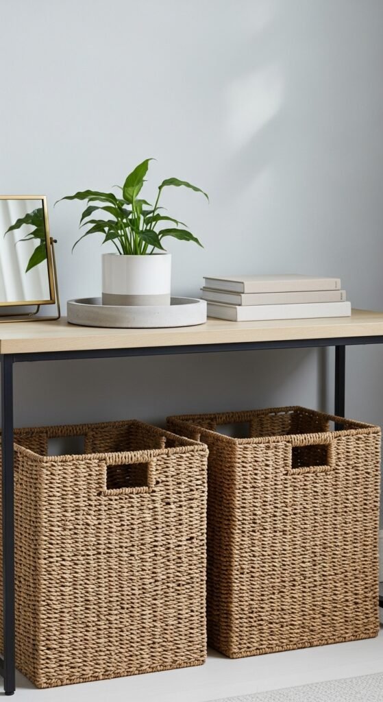 [Image Prompt] A bright entryway with a narrow wooden console table styled with a ceramic lamp, a small vase of fresh greenery, stacked neutral books, and a woven basket underneath, photographed in soft natural daylight.