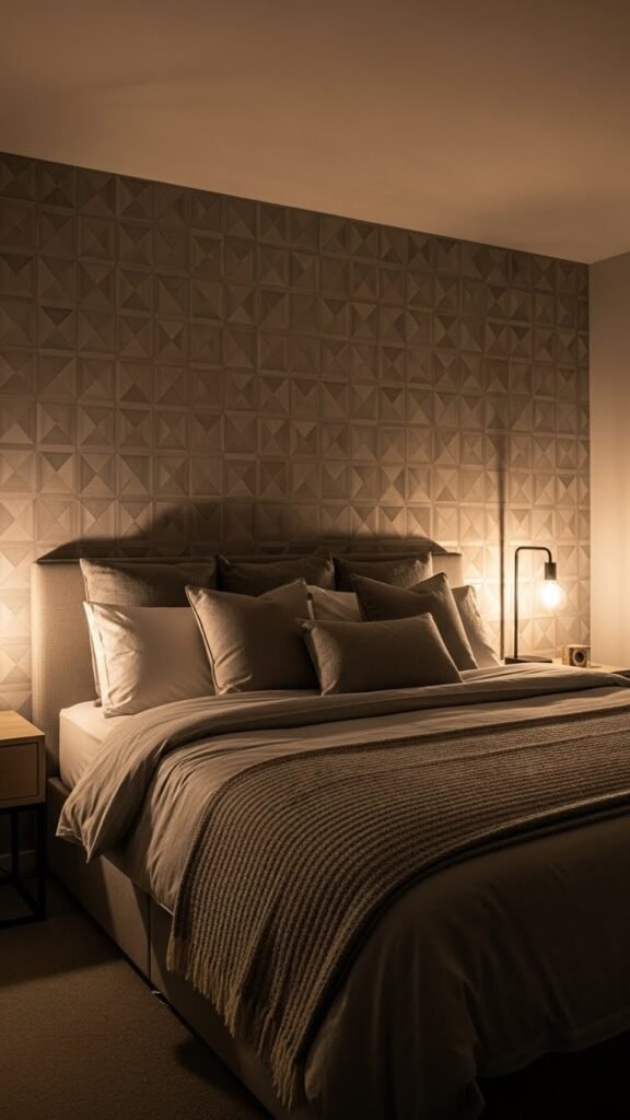 Lighting can make or break textured wallpaper. The goal is to highlight depth, not flatten it.