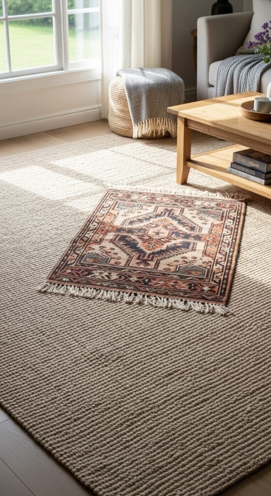 Layering rugs adds depth and warmth without covering the entire floor. Use a simple base rug and place a smaller patterned rug on top. The contrast in texture creates visual comfort.