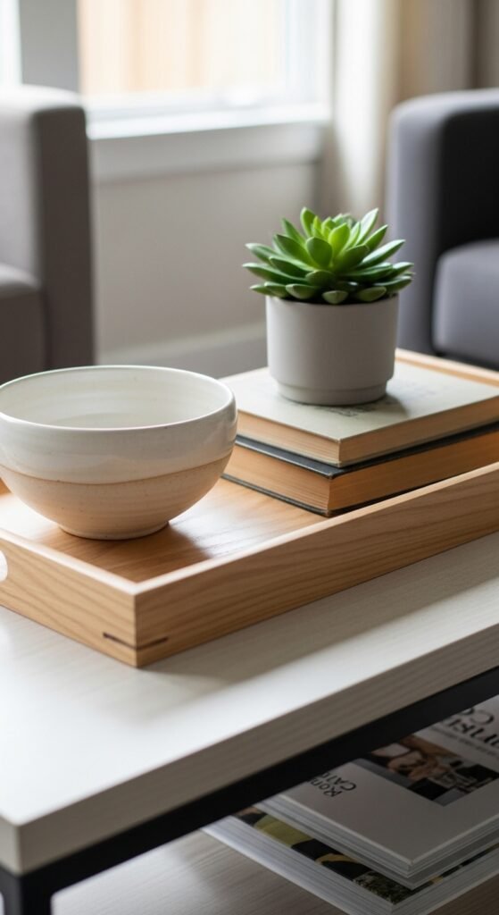 Change what sits inside the tray as the year goes on. Books, candles, or small bowls all work.